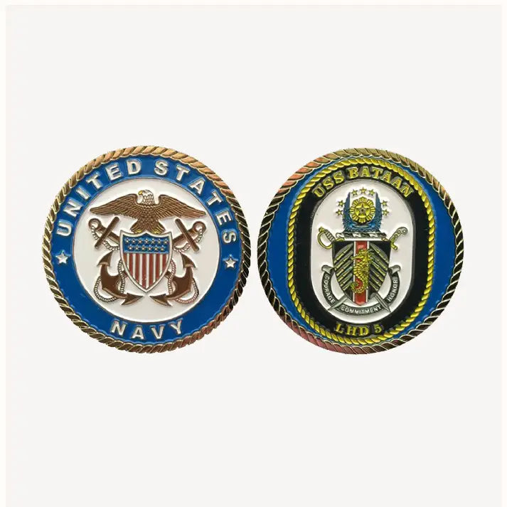 USS Bataan LHD 5 Challenge Coin (Officer Version). This product is Offically Licensed by the Department of the Navy. All royalities paid goes for the support of the Morale Wellness and Recreation (MWR) program for the Navy.