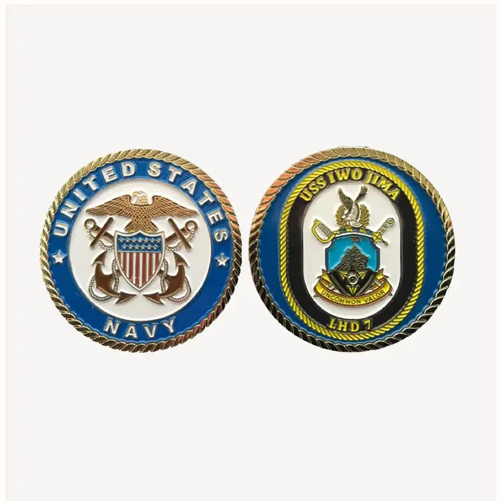 USS Iwo Jima LHD 7 Challenge Coin (Officer Version). This product is Offically Licensed by the Department of the Navy. All royalities paid goes for the support of the Morale Wellness and Recreation (MWR) program for the Navy.