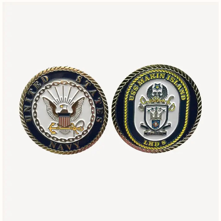 USS Makin Island LHD 8 Challenge Coin (Enlisted Version). This product is Offically Licensed by the Department of the Navy. All royalities paid goes for the support of the Morale Wellness and Recreation (MWR) program for the Navy.