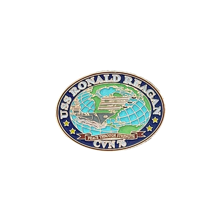 USS Ronald Reagan CVN 76 pin is a blue antiqued silver plated pin. This pin works well as a hat pin or lapel pin and looks great on a Military Veterans Ballcap or Veterans Service Cap. It's a wonderful addition to any pin collection and makes a great gift for those who served on the USS Ronald Reagan. Product is Offically Licensed by the Navy.